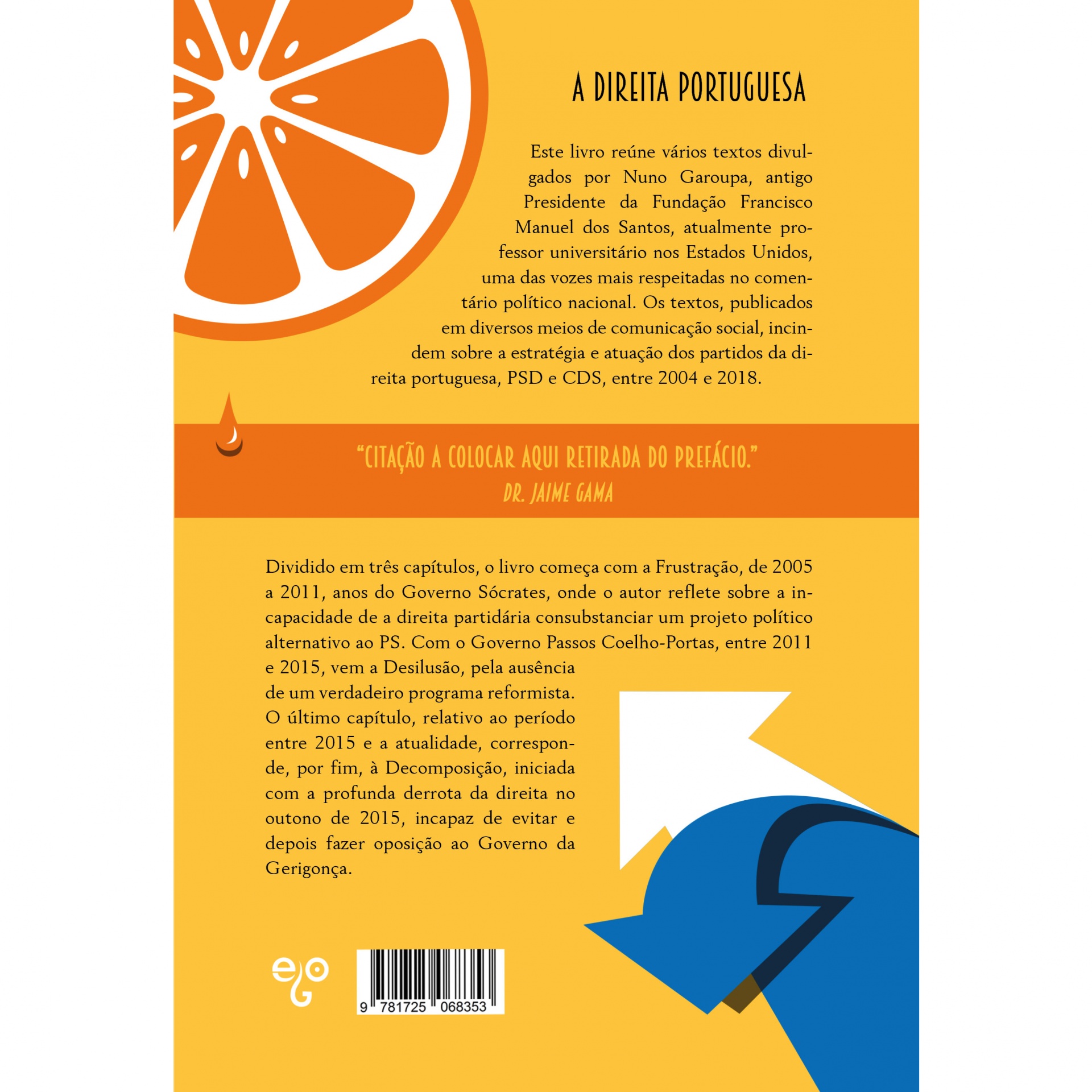 Este livro reúne vários textos divulgados por Nuno Garoupa, antigo Presidente da Fundação Francisco Manuel dos Santos, atualmente professor universitário nos Estados Unidos, uma das vozes mais respeitadas no comentário político nacional. Os textos, publicados em diversos meios de comunicação social, incindem sobre a estratégia e atuação dos partidos da direita portuguesa, PSD e CDS, entre 2004 e 2018.
