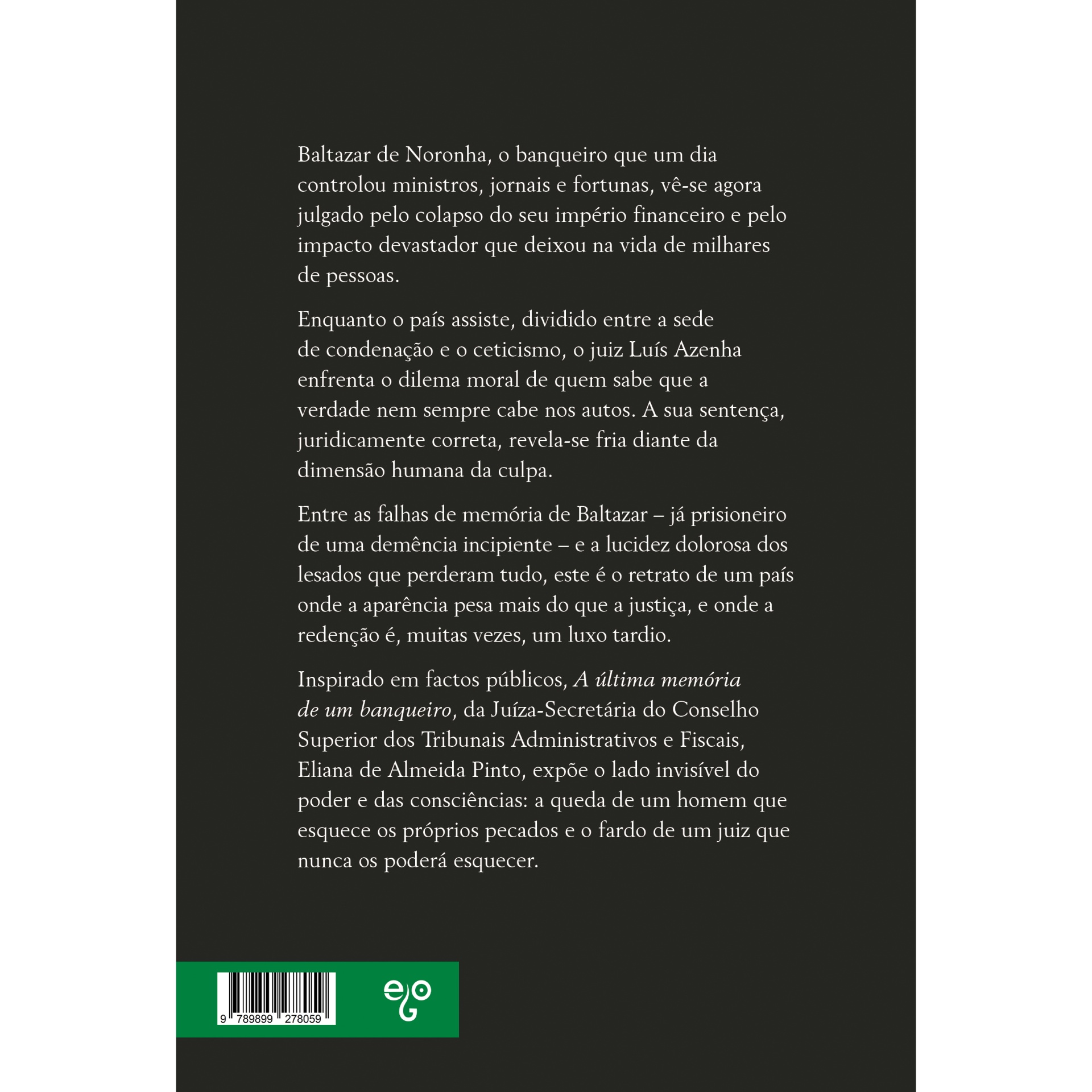 Inspirado em factos públicos, A última memória de um banqueiro, da Juíza-Secretária do Conselho Superior dos Tribunais Administrativos e Fiscais, Eliana de Almeida Pinto, expõe o lado invisível do poder e das consciências: a queda de um homem que esquece os próprios pecados e o fardo de um juiz que nunca os poderá esquecer.